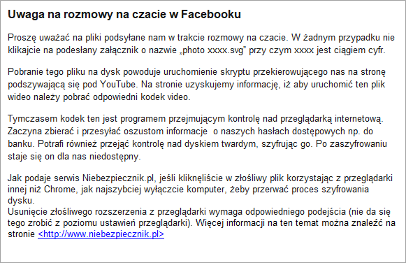 Do zarażenia dochodzi najczęściej przez uruchomienie załącznika poczty elektronicznej, pochodzącego od zaufanych firm takich jak DHL, Pay-Pal, bank, nadpłata faktury lub niezapłacona podobno faktura itp. Swoją drogą dziwię się, iż firmy te tak spokojnie podchodzą do ataku na ich podstawę działania jakim jest zaufanie klientów. Działanie przestępców przypomina działanie łajdaków podsyłających złośliwe oprogramowanie typu „ransomware”, czyli takie, które wpierw szyfruje część dysku i podobno, za odpowiednią opłatą pozwala na odszyfrowanie zaszyfrowanych plików zaatakowanego użytkownika. Jeżeli zapłaciłeś łajdakowi to popełniłeś duży błąd gdyż kodu i tak nie dostaniesz a pieniądze i dane utraciłeś.