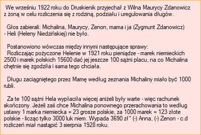 Wróciliśmy z tatą do Wilna bardzo z siebie niezadowoleni. Obaj ponieœliœmy porażkę. Ja z kościołem a tata z finansami rodziny swojej żony. Pokłócił się z nimi, nie podpisał końcowej notatki i w przyszłości nie chciał nic słyszeć o tych sprawach, a dyskusje na ten temat zawsze zamykał zdaniem "ja twego posagu nie zmarnowałem". I nie mógł, bo go nie dostał. O to właśnie chodziło. Więzy rodzinne zostały potargane, mocno poluzowane, za wyjątkiem jednej cioci Heli.
