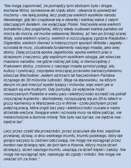20 września 1922 roku w Wilnie, Józef Piłsudski wygłosił przemówienie o wspólnych dziejach Polski i Litwy: