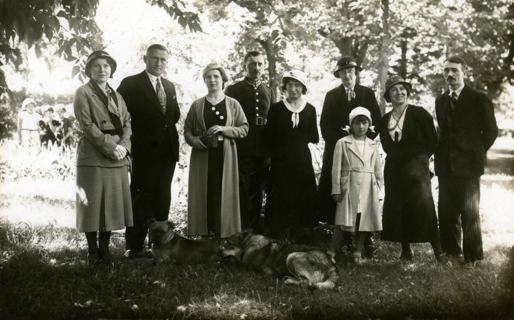 Helena Rewkowska (Niedzińska), piąta z lewej strony, Janina i Michał Golcowie, druga u piewszy z pawej, oraz ich córka Irena - obok nich. Na ziemi leży wilczur Pik, który później będzie w Druskienikach u cioci Michaliny Neufeld (Niedzińskiej), następnie w Wilnie u nas, Józefy i Maurycego Zdanowiczów, by ostatecznie trafić do Brześcia - 1932.08