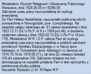 Dokument 94 ; zaliczenie okresu emerytalnego Heleny Rewkowskiej (Niedzińskiej), Ministerstwo Wyznań Religijnych i Oświecenia Publicznego, Warszawa 5 czerwiec 1928 roku ;