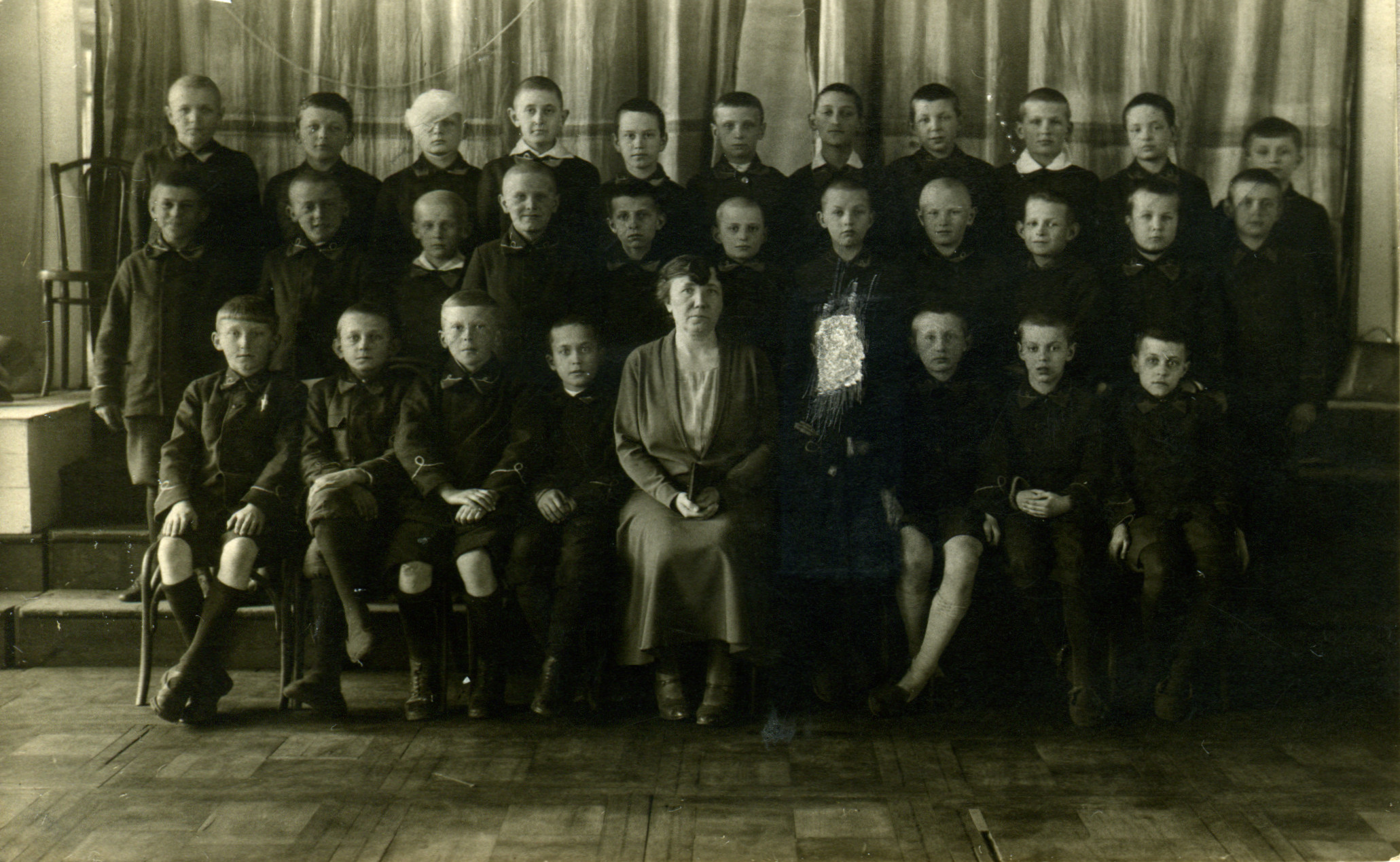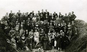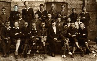 Luty 1935 roku - na zdjęciu przykucnęli od lewej: Marian Muczyński, Konopnicki, Julek Krukowski, Olaf Dworakowski, Marian Truszkowski, ja, nie pamiętam nazwiska, Janusz Zaleski. Stoją: Czyżun, Bohdanowicz, Kazik Szyszkiewicz, Edek Kuczys, Romek Lipiński, nasz profesor od języka polskiego, hr. Brzostowski, Zakrzewski, Cyryl Pawłowski, Kazik Skawiński i Jakubowski.