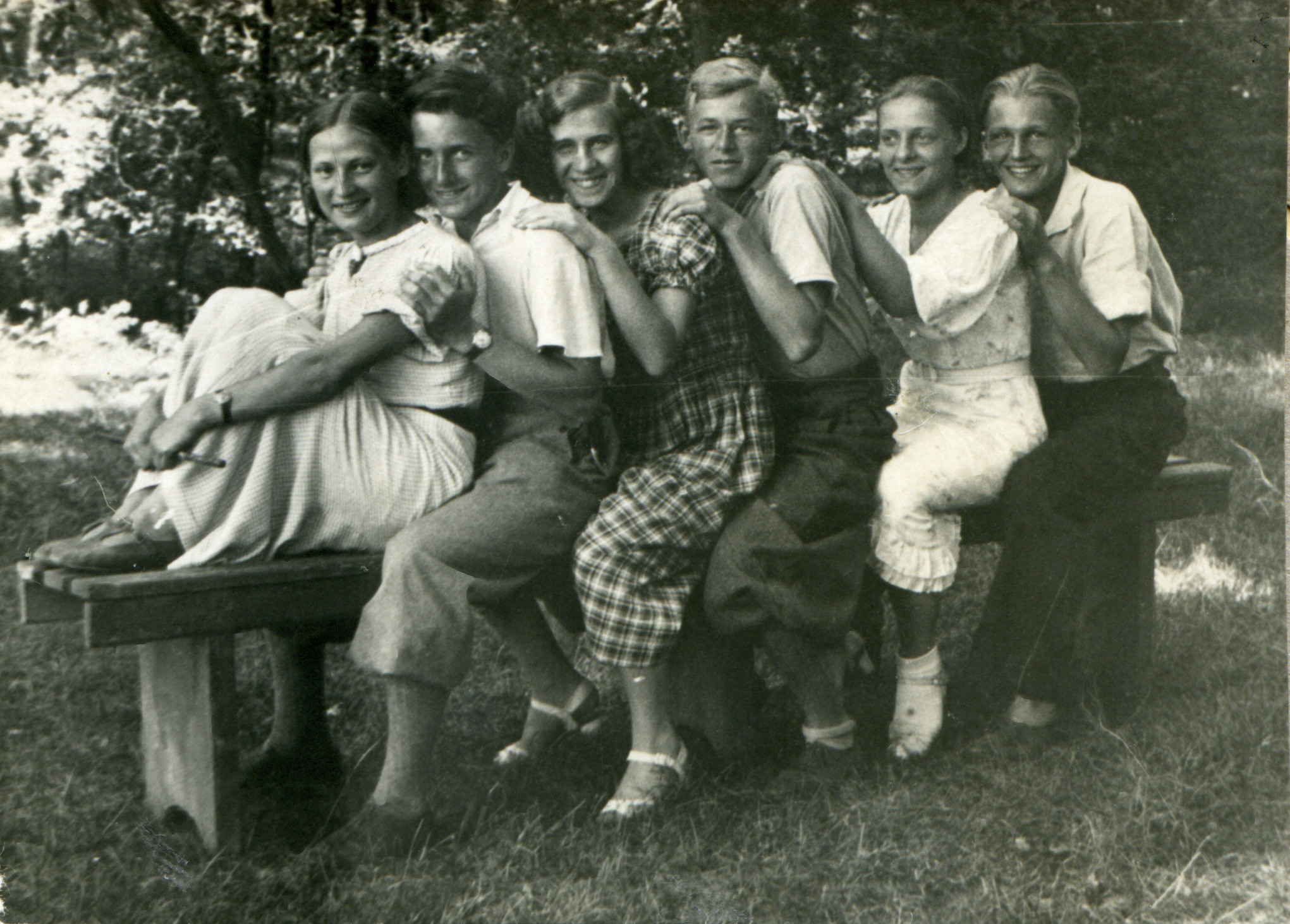Część druhów z 7-ej Drużyny Harcerskiej na podwórku szkolnym P.S.T. w Wilnie. Na kolanach Marian Truszkowski, za nim harcmistrz prof. M. Puciata. Na lewo od niego: Romek Lipiński, Andrzej i Staszek Kondratowicz (spotkałem ich w 1940 roku na podwórku więzienia na Łukiszkach), oraz Zygmunt Zdanowicz. Na prawo od drużynowego: Leopold Konopnicki. Za nim z-ca drużynowego Józek Trocki - student. Obok niego stoi harcerz, którego nie pamiętam a na końcu Cyryl Pawłowski, w czapce i z laską Józka Trockiego. Drużynowy również zamienił się czapkami z Leopoldem.