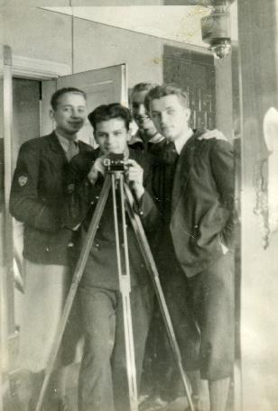 Zastęp "Jeleni" przed lustrem w mieszkaniu Kazika Skawińskiego - od lewej Cyryl Pawłowski, Kazik Skawiński, Zygmunt Zdanowicz i Olaf Dworakowski. Na zbiórce przerabialiśmy program egzaminu na stopień "Harcerza Orlego".