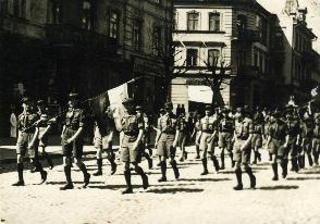 2 maja 1937 roku otwarcie harcerskiego sezonu letniego. Sztandar 7-ej Drużyny Harcerskiej w Wilnie niesie Romek Lipiński, na lewo od niego Olaf Dworakowski, na prawo Zygmunt Zdanowicz.
