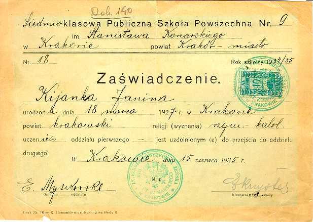 Dokument 140: pierwsze świadectwo szkolne Janiny Kijanki