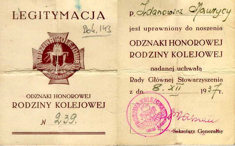 Dokument 143 ; Legitymacja Odznaki Honorowej Rodziny Kolejowej dla Maurycego Zdanowicza.