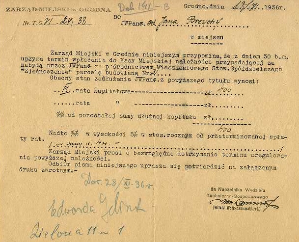 Dokument 141 ; Przypomnienie o terminie wpłaty kolejnej raty za zakup parceli przez inż. Jana Kazimierza Breychę - Grodno 18 listopad 1936 roku ;