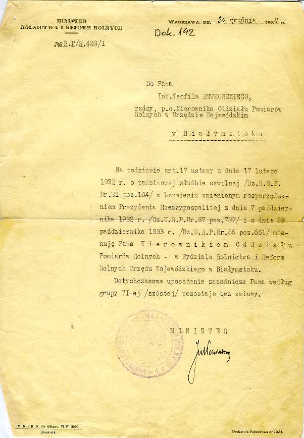 Dokument 142 ; mianowanie dla Teofila Rewkowskiego na stanowisko Kierownika Pomiarów Rolnych w Wydziale Rolnictwa i Reform Rolnych Urzędu Wojewódzkiego w Białymstoku, Białystok 20 grudzień 1937 roku.