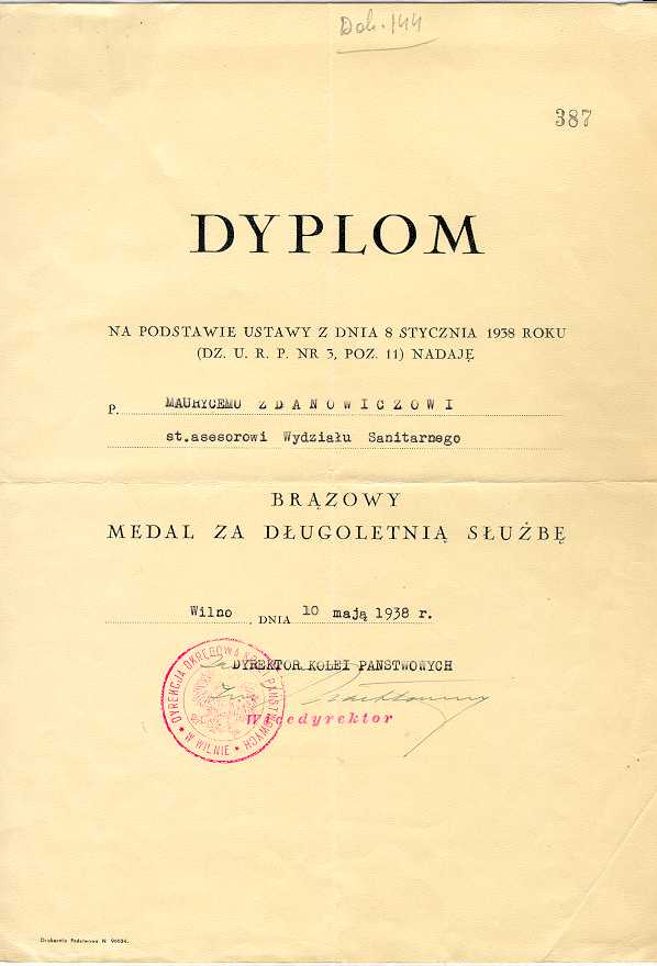 Dokument 144 ; Dyplom nadania Brązowego Medalu za Długoletnią Służbę dla Maurycego Zdanowicza - Wilno, 10 maj 1938 roku.