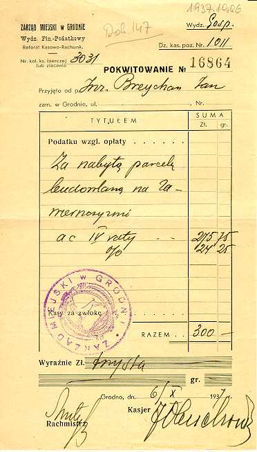 Dokument 147 ; Pokwitowanie za zakup działki przez Jana Breychę, Grodno, 6 październik 1937 roku.