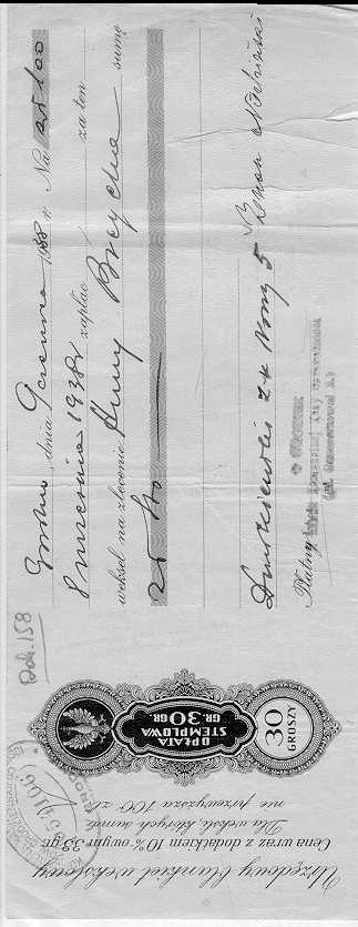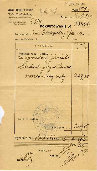Dokument 148 ; Pokwitowanie za zakup działki przez Jana Breychę, Grodno, 3 marzec 1938 roku.
