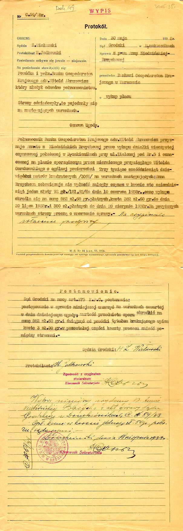 Dokument 149 ; postanowienie Sądu Grodzkiego w Druskienikach o przyznaniu prawa do działki, Druskieniki 30 maj 1938 roku.