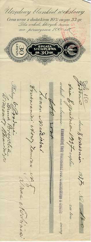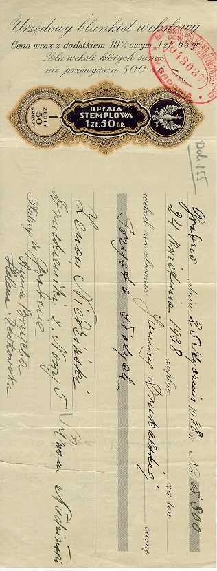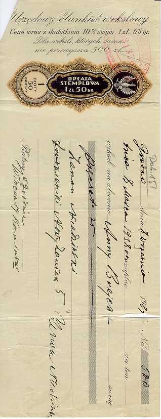 Dokument 150 ; Urzędowy blankiet wekslowy Zenona Niedzińskiego wykupiony przez Annę Breychę, 8 wrzesień 1937 roku.