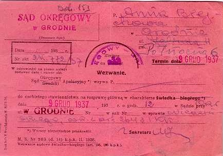 Dokument 153 ; Wezwanie do sądu p. Anny Breychy w sprawie Zenona Niedzińskiego, Grodno 9 grudzień 1937 roku.