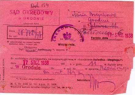 Dokument 154 ; Wezwanie do sądu p. Anny Breychy w sprawie Zenona Niedzińskiego, Grodno 17 stycznia 1938 roku.