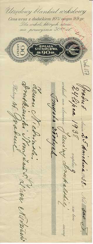 Dokument 155 ; Urzędowy blankiet wekslowy Janiny Drukalskiej do zapłacenia przez Zenona Niedzińskiego, 25 styczeń 1938 roku.