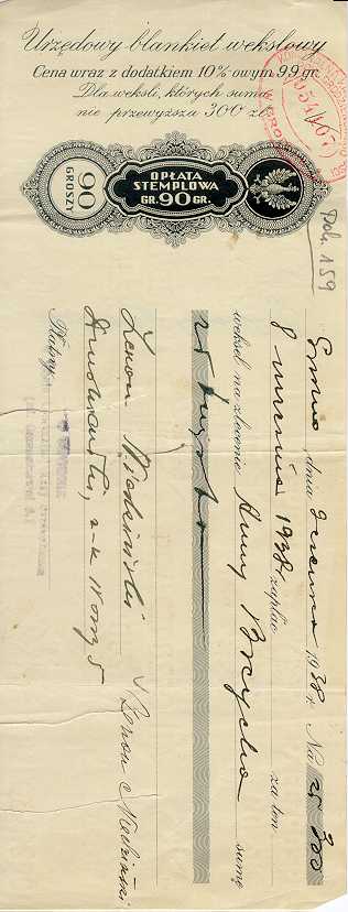 Dokument 158 ; urzędowy blankiet wekslowy Anny Breychy do zapłacenia przez Zenona Niedzińskiego, 9 czerwca 1938 roku.