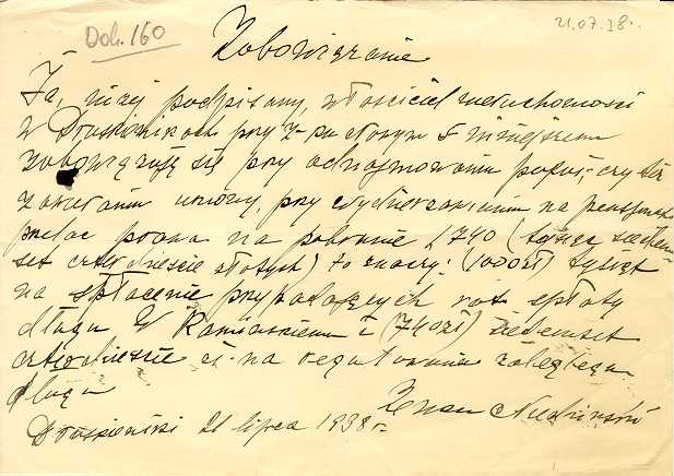 Dokument 160 ; zobowiązanie Zenona Niedzińskiego, Druskienniki, 21 lipiec 1938 roku.