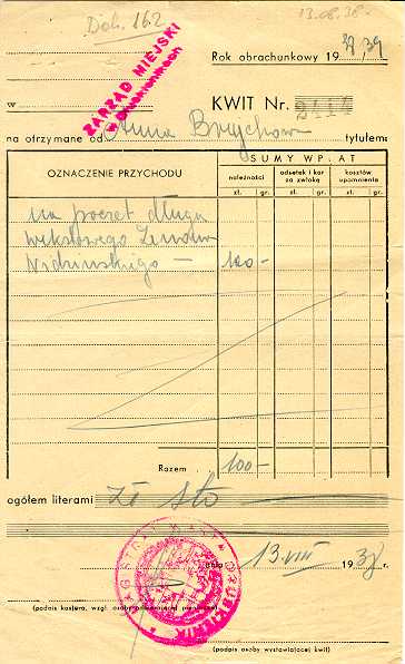Dokument 162 ; Kwit potwierdzający wpłatę Anny Breychy (Niedzińskiej) na poczet długu wekslowego Zenona Niedzińskiego, Druskienniki 13 sierpień 1938 roku