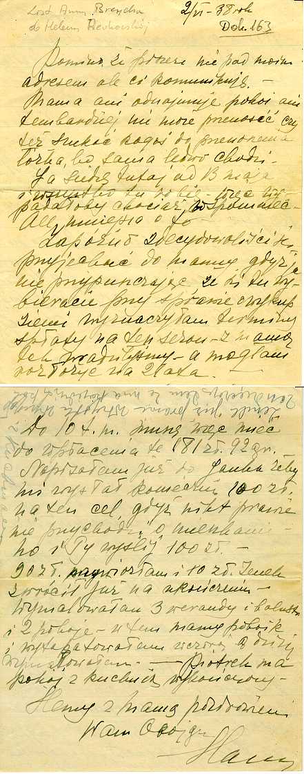 Dokument 163 ; list do cioci Heleny Rewkowskiej (Niedzińskiej) w którym ciocia Anna Breycha (Niedzińska) żali się i dzieli kłopotami, 2 czerwiec 1938 roku.