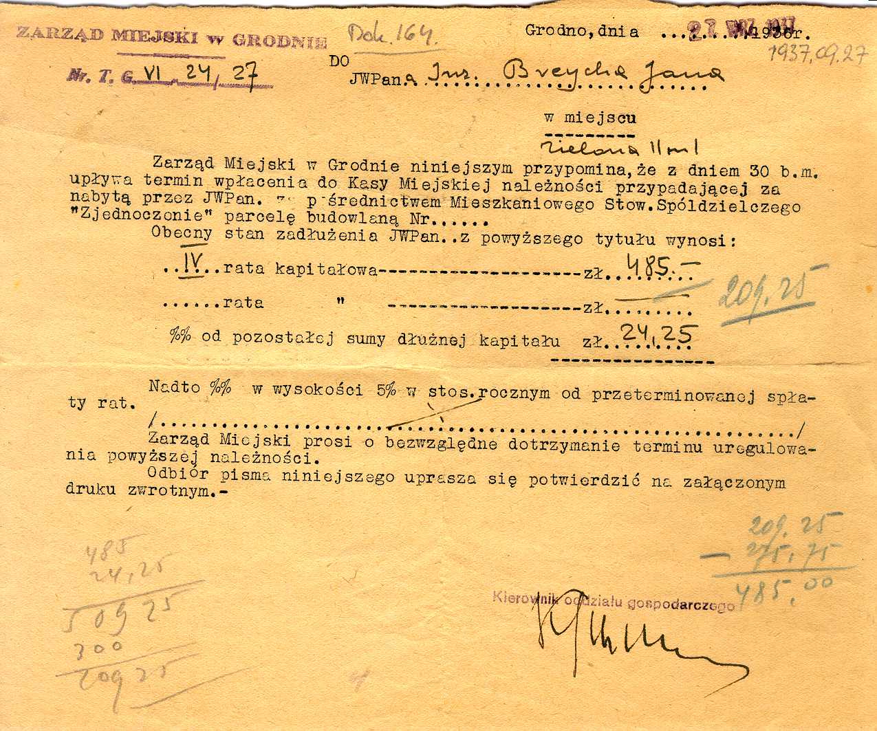 Dokument 164 ; Przypomnienie o terminie wpłaty raty przez Jana Kazimierza Breychę, Grodno 27 wrzesień 1937 roku.