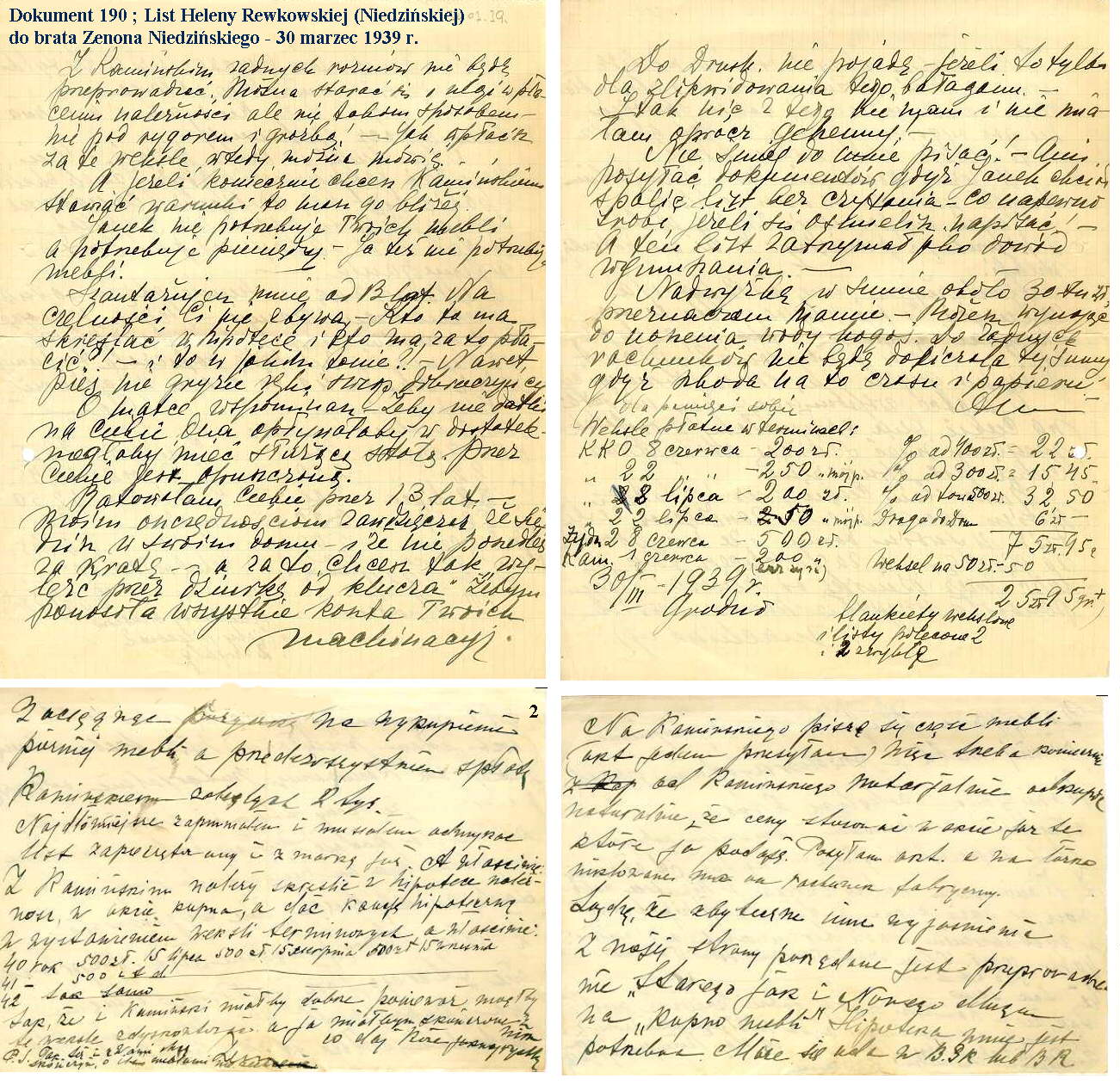 Helena Rewkowska (Niedzińska) zapłaciła za brata Zenona Niedzińskiego ratę w banku - 60,00 zł i w magistracie 150,00 zł. Razem jego dług zaciągnięty w latach 1926 - 1939 u Heleny Rewkowskiej wynosił 873,00 zł.