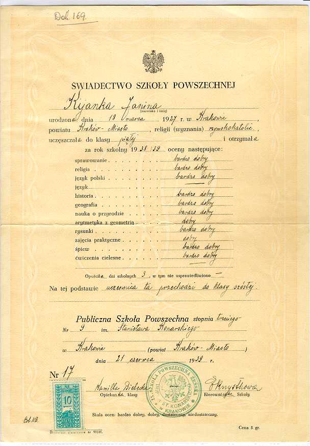 Dokument 169 : Świadectwo ukończenia piątej klasy szkoły powszechnej przez Janinę Kijankę (Zdanowicz), Kraków 21 czerwiec 1939 roku ;