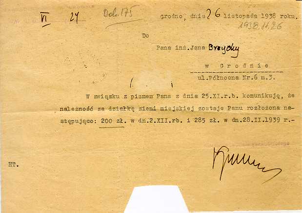Dokument 175 ; rozłożenie płatności za działkę budowlaną; Grodno 26 listopad 1938 roku ;