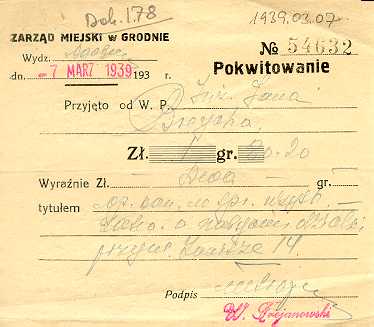 Dokument 178 ; pokwitowanie wpłaty kolejnej raty za działkę budowlaną, Grodno 7 marzec 1939 roku ;