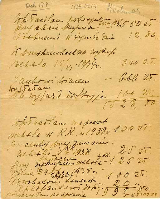 Dokument 179 ; Rozliczenie weksli Zenona Niedzińskiego dokonane przez Helenę Rewkowską (Niedzińską) - Białystok 14 wrzesień 1938 roku ;