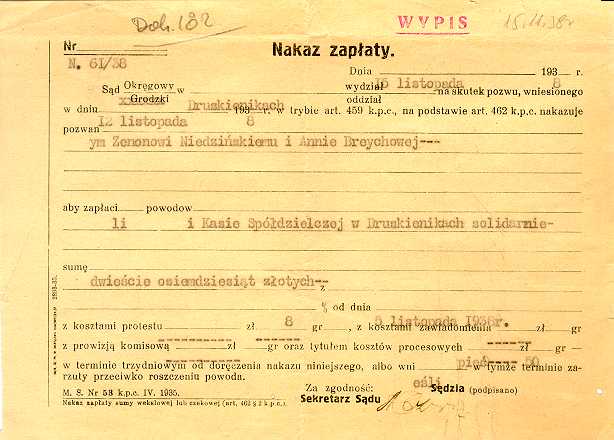 Dokument 182 ; Nakaz zapłaty weksla wydany przez Sąd Grodzki w Druskiennikach w stosunku do Zenona Niedzińskiego i Anny Breychy (Niedzińskiej) ; Druskienniki 15 listopad 1938 roku ;