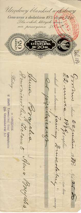 Dokument 184 ; Blankiet wekslowy Anny Breychy (Niedzińskiej) Grodno 22 grudnia 1938 roku ;
