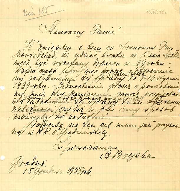 Dokument 185 ; Prośba Anny Breychy (Niedzińskiej) o odroczenie płatności, Grodno 15 grudzień 1938 roku