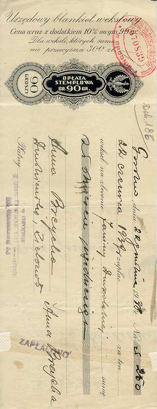 Dokument 186 ; Blankiet wekslowy Anny Breychy (Niedzińskiej); Grodno 22 grudzień 1938 roku ;