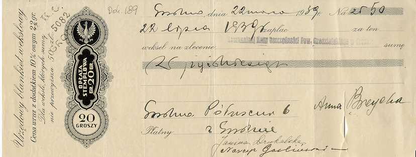 Dokument 189 ; Blankiet wekslowy Anny Breychy (Niedzińskiej) ; Grodno 22 marca 1939 roku ;