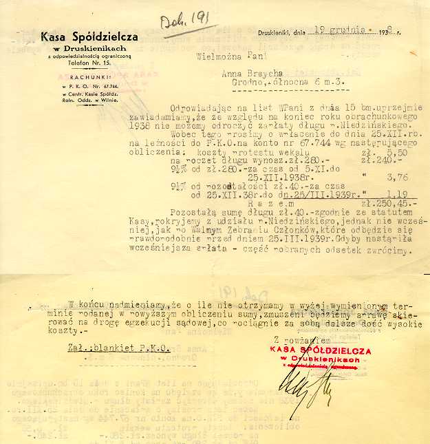 Dokument 191 ; Kasa Spółdzielcza w Druskienikach rozliczenie spłat Anny Breychy (Niedzińskiej) ; Druskieniki 18 grudnia 1938 roku ;