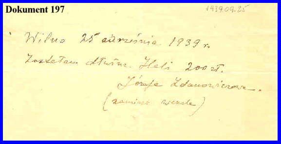 Dokument 197 ; Wystawione przez Józefę Zdanowicz (Niedzińską) pokwitowanie na 200,00 zł pożyczone od Heleny Rewkowskiej (Niedzińskiej) ; Wilno 25 wrzesień 1939 roku ;