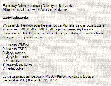 Zaświadczenie o ukończeniu kursu, podwyższającego kwalifikacje nauczycielskie dla Heleny Rewkowskiej (Niedzińskiej) ; Białystok 1940.06.20 - 1940.07.20 plus moje tłumaczenie: