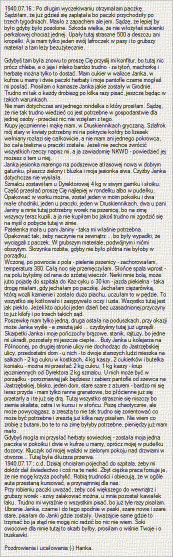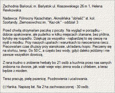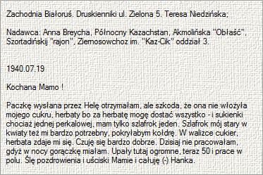 List z Kazachstanu, cioci Anny Breychy (Niedzińskiej) do siostry Heleny Rewkowskiej (Niedzińskiej) z Kaz-cik 16 lipca 1940 roku.