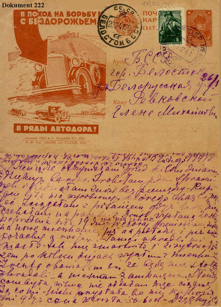 Kartka pocztowa cioci Anny Breychy (Niedzińskiej) do siostry Heleny Rewkowskiej (Niedzińskiej) z 10 lutego 1941 roku;
