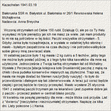 Kartka pocztowa cioci Anny Breychy (Niedzińskiej) do siostry Heleny Rewkowskiej (Niedzińskiej) z 19 marzec 1941 roku;
