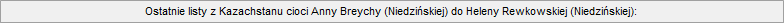 Na tym korespondencja urwała się z powodu wybuchu wojny niemiecko - radzieckiej. Jakie ją czekają warunki egzystencji, teraz w czasie wojny, gdy dotychczasowe pokojowe były już okropne, wprost nieludzkie ? Anna Breycha (Niedzińska) umrze tam na zesłaniu 12 grudnia 1942 roku