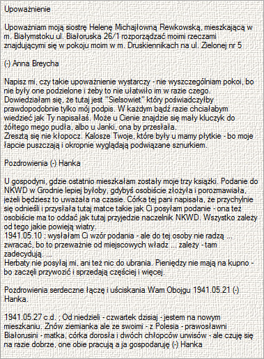 21 maja 1941 roku ; Upoważnienie udzielone przez Annę Breychę (Niedzińską) swojej siostrze Helenie Rewkowskiej (Niedzińskiej);