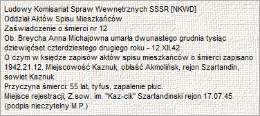 12 grudnia 1942 roku w sowchozie Kaz-cik w Kazachstanie, umarła przebywająca tam na zesłaniu Anna z Niedzińskich Breycha