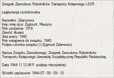 Legitymacja związkowa Związku Zawodowego Robotników Transportu Kolejowego LSSR (w języku rosyjskim i litewskim) - oryginał dokumentu znajduje się w ZUS jako dowód stażu pracy (Brak tego dokumentu)
