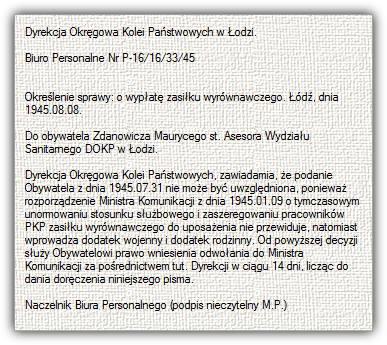 1945/08/08: Dokument (zaginiony) ; Odpowiedź DOKP na pismo Maurycego Zdanowicza w sprawie Dokumentu 256.