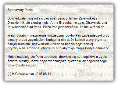Dokument 251; (14 sierpień 1945) Brudnopis listu cioci Heleny Rewkowskiej (Niedzińskiej) napisanego do pana Prośniewskiego w Kazachstanie - patrz Rozdział 115