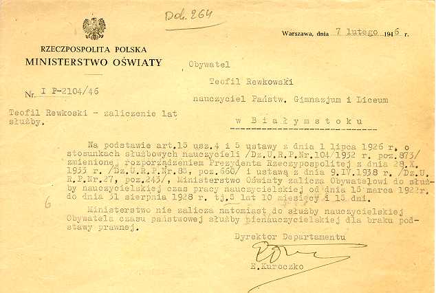 Dokument 264; Odpowiedź z Ministerstwa Oświaty dla Teofila Rewkowskiego - Warszawa 7 luty 1946 roku ;
