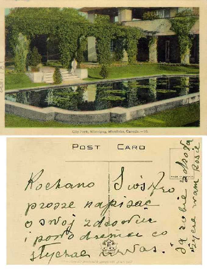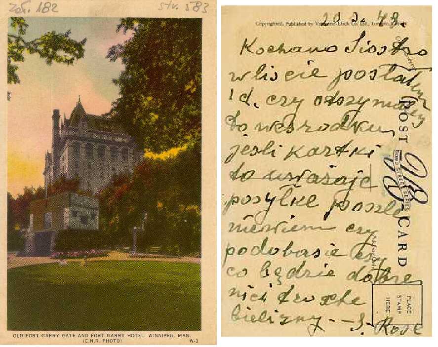 Kartki pocztowe z Winnipeg (Kanada) obie strony, od Róży Nowickiej (Niedzińskiej) do siostry Heleny Rewkowskiej (Niedzińskiej) ;